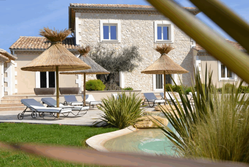 Dès l’entrée, on découvre une élégante allée bordée d’oliviers menant à la maison principale. À l’extérieur, la terrasse ombragée et la piscine invitent à la détente sous le soleil du Sud.